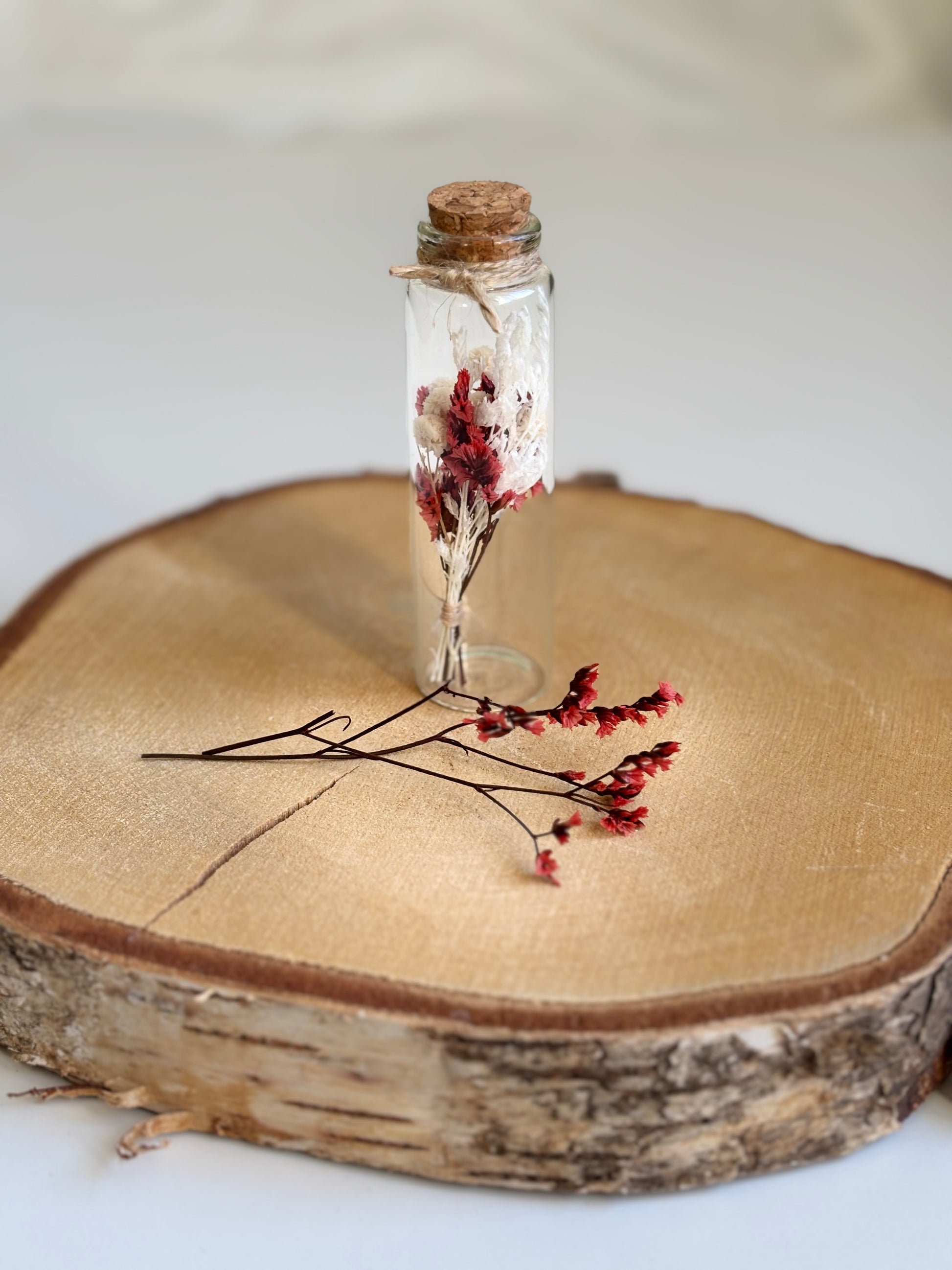 Apportez une touche de poésie à votre intérieur avec cette délicate fiole en verre renfermant un petit bouquet de fleurs séchées rouges et blanches. Fermée par un bouchon en liège et ornée d’une ficelle naturelle, elle évoque la simplicité et l’élégance de la nature.